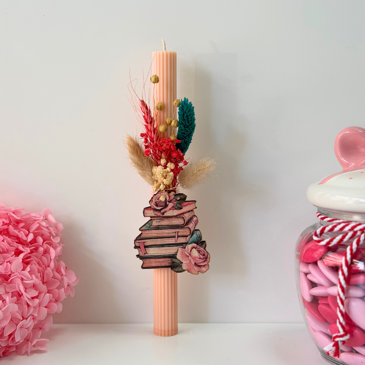 Χειροποίητη αρωματική λαμπάδα με αποξηραμένα άνθη για τους λάτρεις των βιβλίων. Ρομαντικό στυλ σε παλ τόνους.